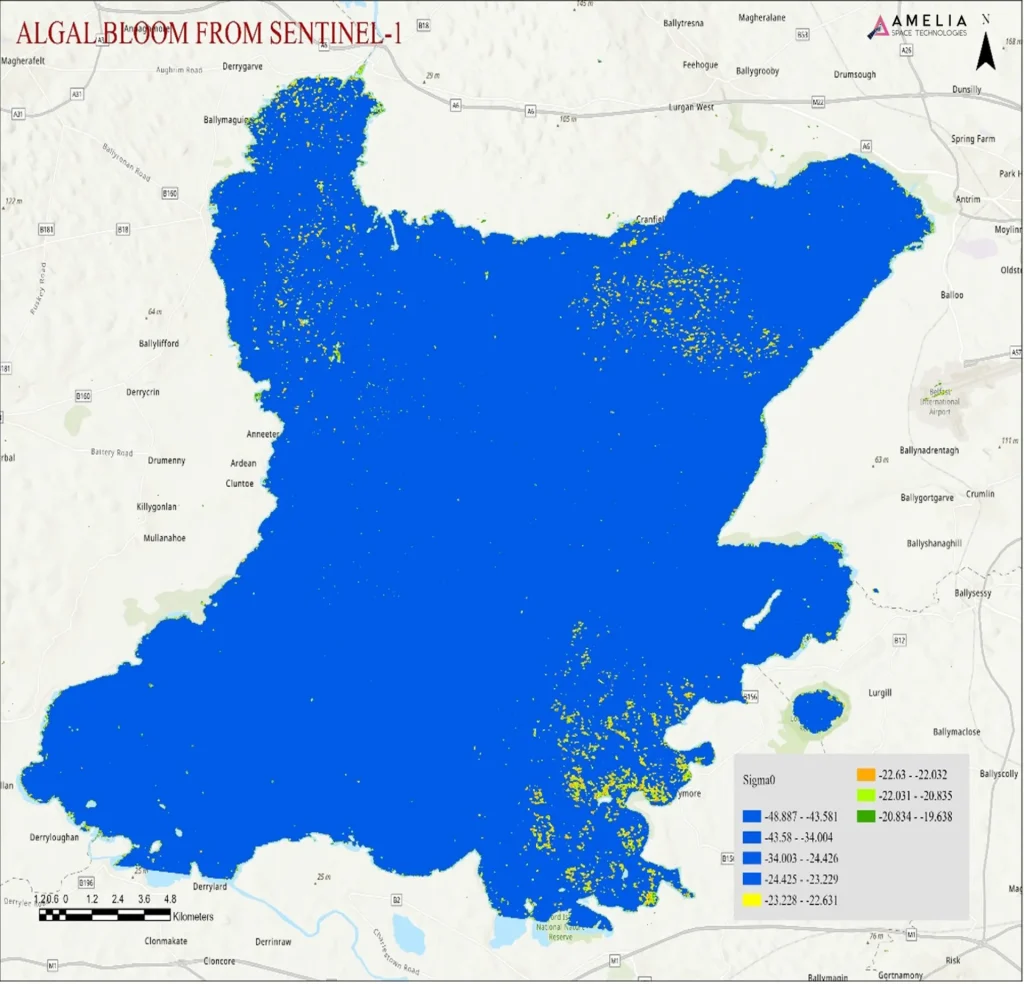 - Data Acquisition: Download SAR imagery from data sources. - Region Subset: Subset data to focus specifically on the area of interest. In this case, Lough Neagh in Northern Ireland. - Orbital Correction: Correct for geolocation errors due to predicted satellite orbit inaccuracies. - Thermal Noise Removal: Remove any thermal noise that may affect low-backscatter areas like open water. - Radiometric Calibration: Convert raw digital numbers into calibrated backscatter values (sigma naught, beta naught, or gamma naught) for quantitative analysis and comparison across different images and time periods. - Speckle Filtering: SAR images contain speckle noise, which can interfere with water classification. The Lee Sigma filter is effective for water surfaces, balancing speckle reduction and feature retention. - Range-Doppler Terrain Correction: Correct for geometric distortions caused by topography to ensure accurate geolocation of features. - Decibelization of Radar Backscatter Coefficients: Decibelization (dB conversion) converts radar backscatter coefficients (Sigma0) into a logarithmic scale. SAR backscatter values vary exponentially, so expressing them in decibels (dB) makes them easier to analyze. - Thresholding Using Band Math: Apply calibrated thresholding techniques using band mathematics to identify the unique backscatter signature of algal blooms, typically falling within the -24 to -20 dB range in VV (Vertical Transmit-Vertical Receive) polarization. - Classification: Apply additional algorithms to further classify and precisely identify the most probable algal bloom regions.